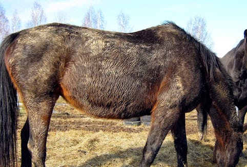 Abnormal Hair Growth: Horses with Cushing's disease may exhibit abnormal hair growth, such as a long and curly coat that fails to shed appropriately, leaving the coat to look patchy over the body.