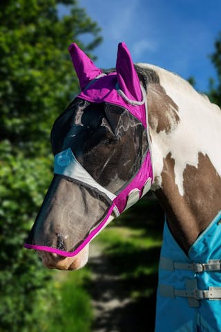 1. horses also tend to have a fly mask when the weather starts to get hot, this is also just an aid to help stop the flies from irritating the horses eyes and helps keep them clean